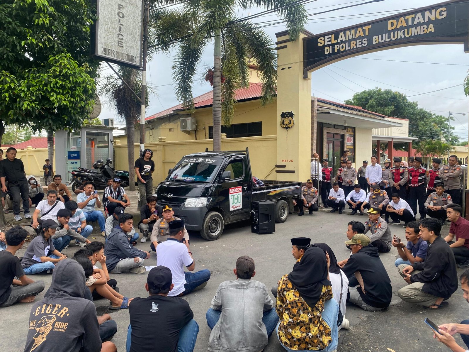 Momen itu terjadi di depan pintu gerbang Mapolres Bulukumba. Massa aksi yang datang menyuarakan tuntutan terkait penegakan hukum dan pelayanan publik, awalnya berdiri. Melihat itu, AKBP Restu Wijayanto langsung turun, melepas jarak, dan ikut duduk di jalan bersama mahasiswa dan masyarakat.