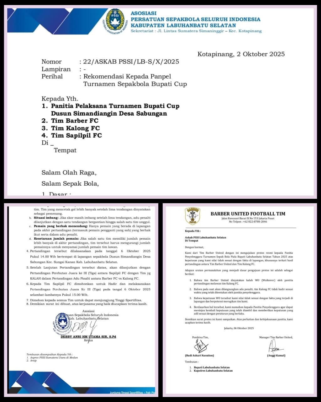 “SK sudah ditandatangani dan menjadi dasar hukum turnamen. Tapi, di lapangan, panitia berjalan seenaknya, mengubah aturan main, dan itu jelas merugikan kami di Barber United,” ujar salah satu perwakilan tim.