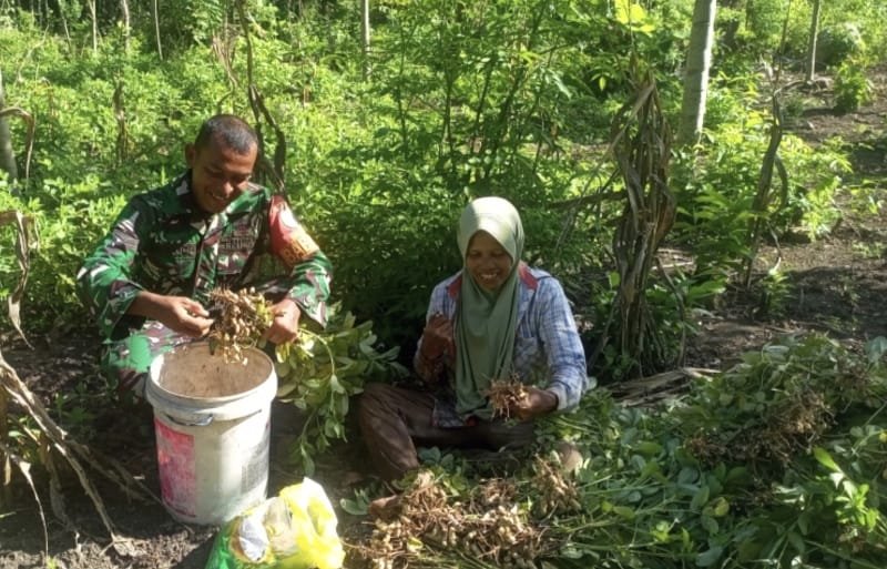 Dalam kegiatan tersebut, Sertu Junaidi tampak berbaur bersama petani, Ibu Khatijah, memanen kacang tanah yang telah memasuki masa panen.