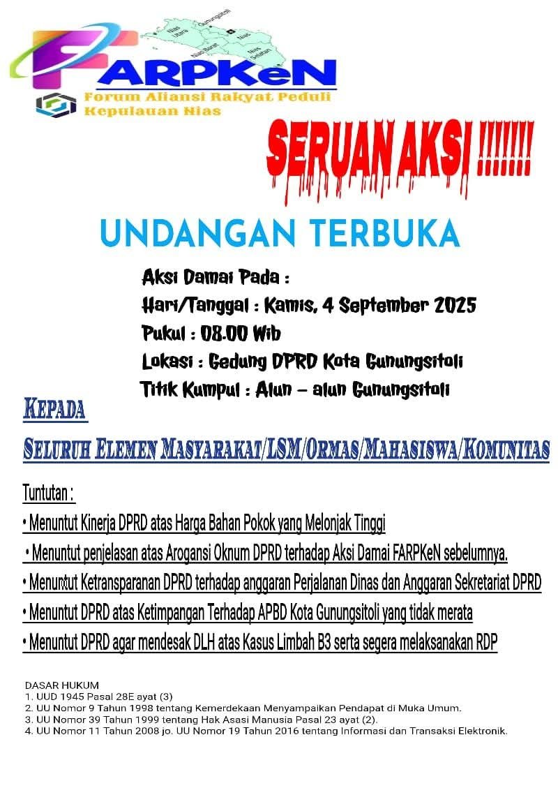 Seruan aksi demo damai yang dimotori oleh Forum Aliansi Rakyat Peduli Kepulauan Nias (FARPKen) dengan menuntut kinerja DPRD atas harga bahan pokok yang melonjak tinggi, menuntut penjelasan atas sikap arogansi oknum DPRD terhadap aksi damai FARPKen sebelumnya.