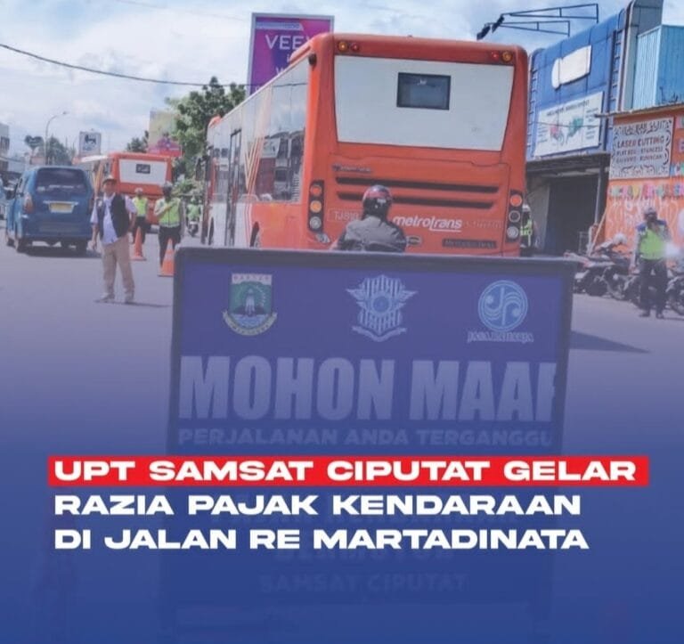 Tangerang Selatan – Unit Pelaksana Teknis (UPT) Samsat Ciputat menggelar razia pajak kendaraan bermotor di Jalan RE Martadinata, Cipayung, Kecamatan Ciputat, Kota Tangerang Selatan, sebagai bagian dari upaya meningkatkan kepatuhan masyarakat terhadap kewajiban pembayaran pajak kendaraan.