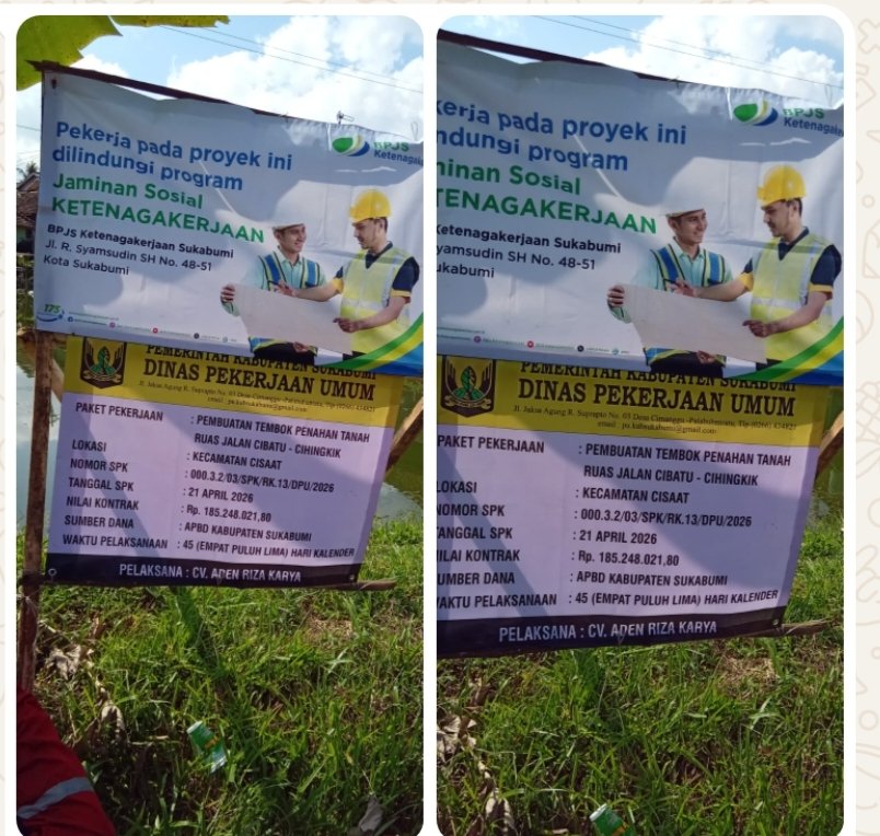 Pekerjaan ini dilaksanakan berdasarkan Nomor SPK: 000.3.2/03/SPK/RK.13/DPU/2026 yang diterbitkan pada tanggal 21 April 2026. Proyek tersebut memiliki nilai kontrak sebesar Rp 185.248.021 yang bersumber dari Anggaran Pendapatan dan Belanja Daerah (APBD) Kabupaten Sukabumi.