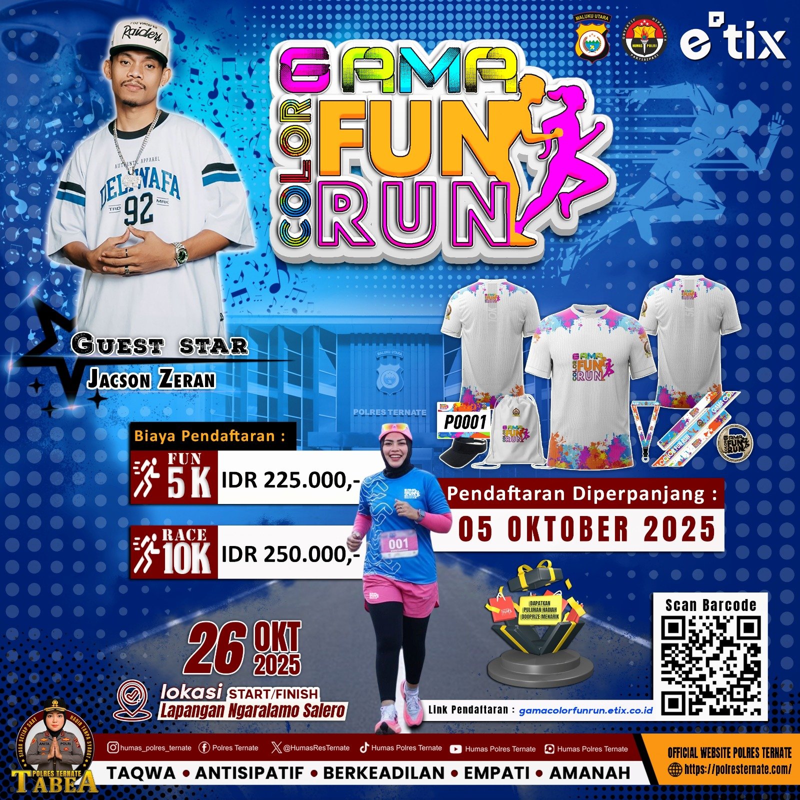 Kapolres Ternate AKBP Anita Ratna Yulianto, S.I.K., M.H., menyampaikan bahwa kuota peserta terbatas dan pendaftaran hanya dibuka hingga 5 Oktober 2025 melalui laman resmi http://gamacolorfunrun.etix.co.id/.
