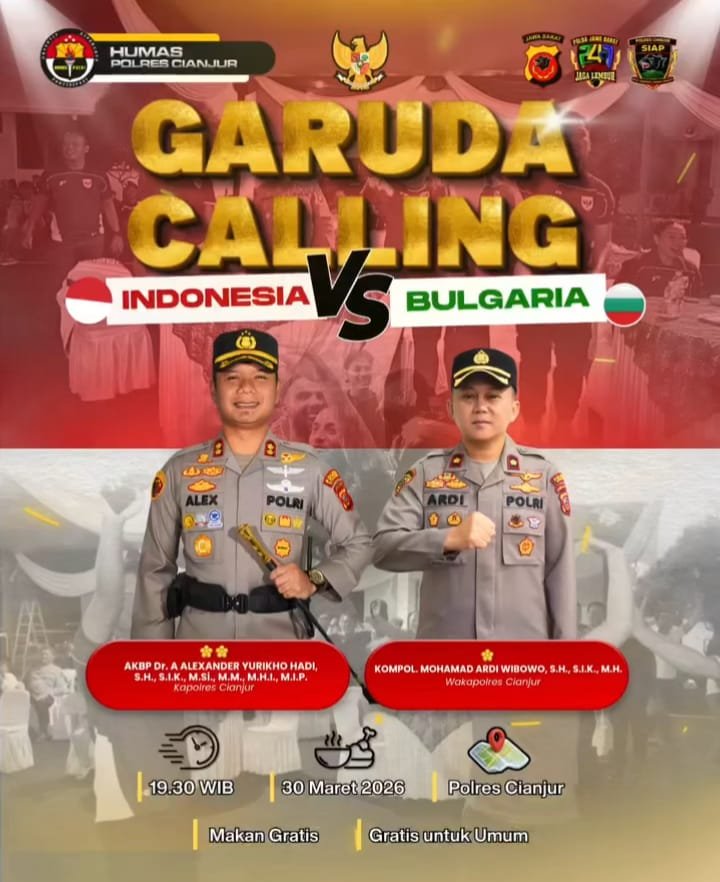 Cianjur – Minggu 29 Maret 2026 — Dalam rangka mendukung perjuangan Tim Nasional Indonesia di kancah internasional, Polres Cianjur menggelar kegiatan nonton bareng ( nobar ) pertandingan sepak bola antara Timnas Indonesia melawan Bulgaria.