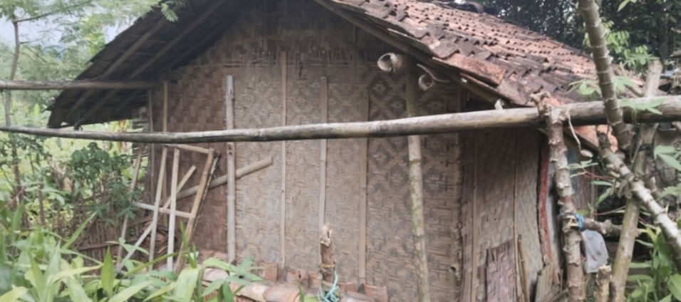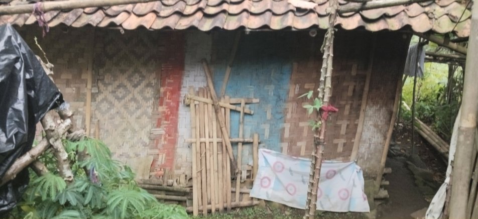 Kondisi rumah tersebut sangat memprihatinkan. Bangunan yang sebagian besar terbuat dari bilik bambu terlihat rapuh dan sudah tidak mampu memberikan perlindungan yang layak bagi penghuninya. Saat hujan turun, atap rumah kerap mengalami kebocoran sehingga mengganggu kenyamanan dan keselamatan penghuni.