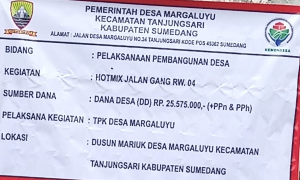 Pelaksanaan pembangunan jalan gank RW 04 Desa Margaluyu Tanjungsari Sumedang , Senin , 15 Desember 2025. Menggunakan dari anggaran Dana Desa Tahun 2025 , jalan gang yang sudah dibangun hotmix dengan panjang 121 meter , tebal kisaran paling tinggi 3 cm , dan lebar 1 meter. Proses pelaksanaanya dilakukan oleh pihak rekanan luar dari putra daerah warga Desa Margaluyu.