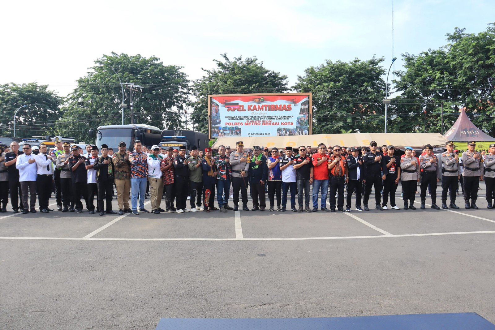 Kpktipikor.id // Bekasi Kota – Dalam rangka menjaga kondusivitas dan stabilitas keamanan menjelang perayaan Natal 2025 dan Tahun Baru 2026, Polres Metro Bekasi Kota menggelar Apel Kamtibmas di halaman Polres Metro Bekasi Kota. Kegiatan ini dipimpin langsung oleh Kapolres Metro Bekasi Kota, Kombes Pol Kusumo Wahyu Bintoro, SH, SIK, MH, serta diikuti oleh berbagai elemen masyarakat dan organisasi kemasyarakatan (ormas).