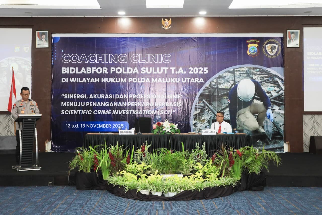 Sofifi, kpktipikor.id – Kepala Kepolisian Daerah Maluku Utara, Irjen Pol. Drs. Waris Agono, M.Si, menghadiri sekaligus membuka secara resmi kegiatan Coaching Clinic Bidang Laboratorium Forensik (Bidlabfor) Polda Sulawesi Utara T.A. 2025, yang berlangsung di Ballroom Hotel Muara, Rabu (12/11/2025).