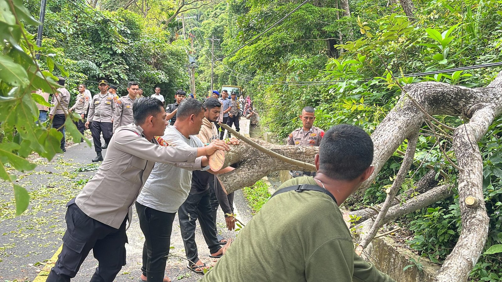 Personel Polres Sabang bersama masyarakat bergotong royong mengevakuasi dan membersihkan batang serta ranting pohon yang menghalangi jalan. Berkat respons cepat dan kerja sama yang solid, proses pembersihan berjalan lancar dan arus lalu lintas di Jalan Tanjakan Gapang kembali normal.