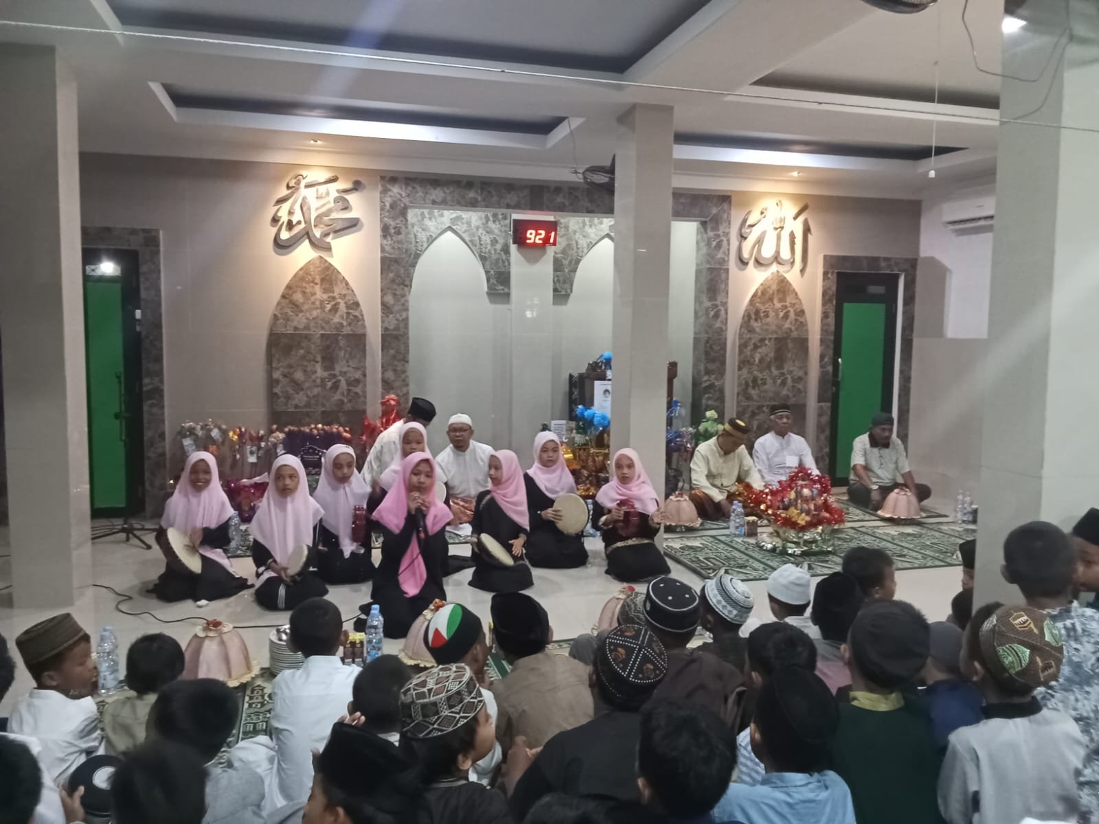 Suasana acara terasa begitu khidmat dan penuh kehangatan. Dekorasi bernuansa Islami menghiasi setiap sudut sekolah, menciptakan atmosfer yang syahdu. kekhusyukan peringatan Maulid.