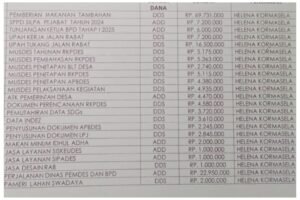 Menurutnya, Berdasarkan dokumen resmi yang kami peroleh, hampir seluruh item kegiatan, mulai dari Musyawarah Desa (Musdes), penyusunan dokumen perencanaan, pelayanan administrasi, hingga pembangunan fisik, tercatat atas nama penerima Penjabat Kepala Desa,” ujar Haming.
