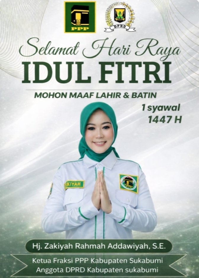 kpktipikor.id || Sukabumi – Ketua Fraksi Partai Persatuan Pembangunan (PPP) DPRD Kabupaten Sukabumi, Hj. Zakiyah Rahmah Addawiyah, S.E., menyampaikan ucapan Selamat Hari Raya Idul Fitri 1 Syawal 1447 Hijriah kepada seluruh masyarakat.