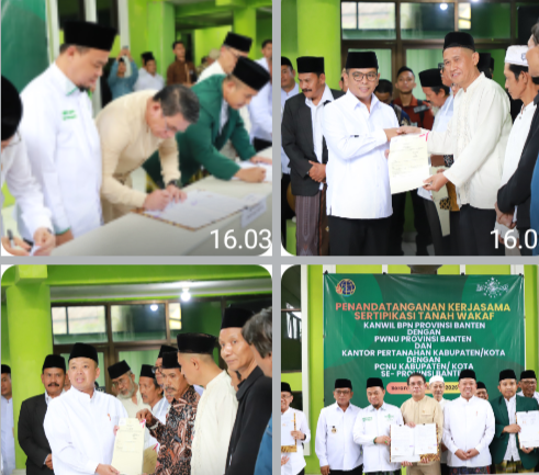 Bertempat di Aula MUI Provinsi Banten, Menteri Nusron menyerahkan 13 sertipikat tanah wakaf untuk rumah ibadah dan Lembaga pendidikan kegamaansekaligus menyaksikan penandatanganan kerja sama percepatan sertipikasi tanah wakaf antara Kanwil BPN Provinsi Banten dengan PWNU Provinsi Banten serta Kantor Pertanahan se-Provinsi Banten.