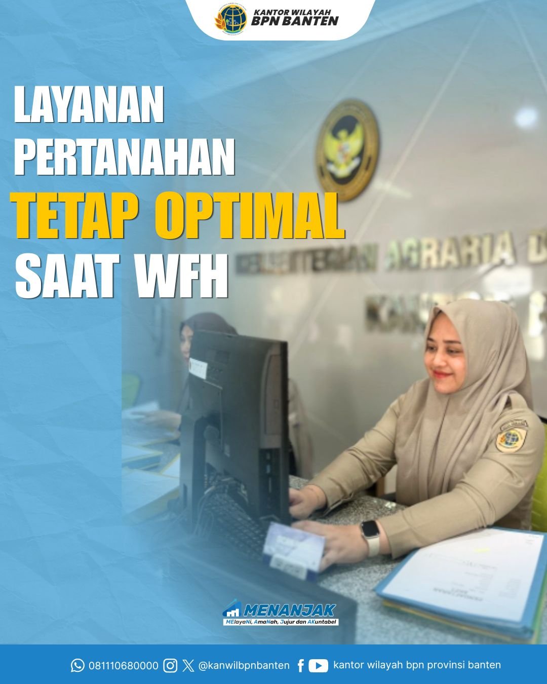 Penerapan kebijakan WFH ini dilakukan sebagai bagian dari upaya peningkatan efektivitas kerja serta penyesuaian sistem kerja yang adaptif. Meski demikian, Kantor Wilayah BPN Provinsi Banten berkomitmen untuk terus menjaga kualitas pelayanan kepada masyarakat dengan mengatur sistem kerja yang seimbang antara bekerja dari rumah ( WFH ) dan bekerja dari kantor ( work from office/WFO ) .
