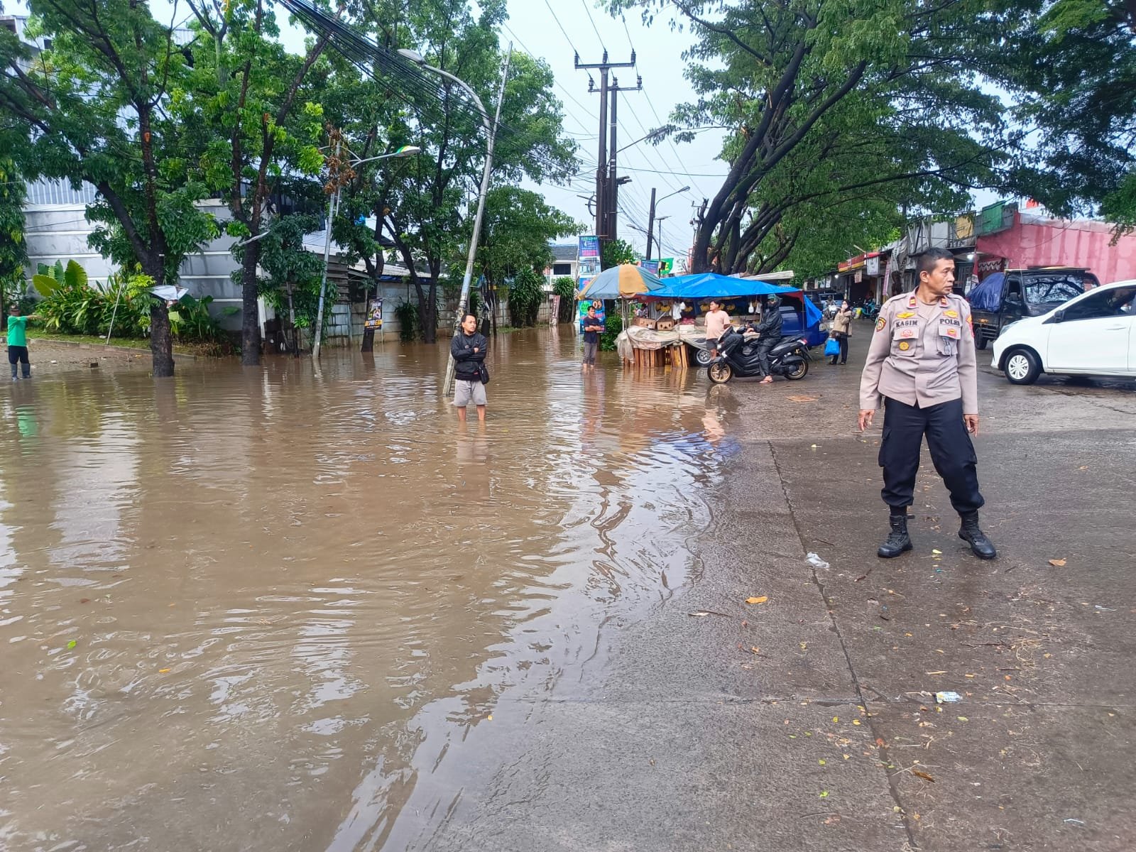 Genangan air diperkirakan terjadi karena saluran air di sekitar lokasi belum mampu menampung debit air, sehingga air meluap ke badan jalan. Meski demikian, petugas memastikan arus lalu lintas tetap berjalan dengan tertib dan aman bagi para pengendara.