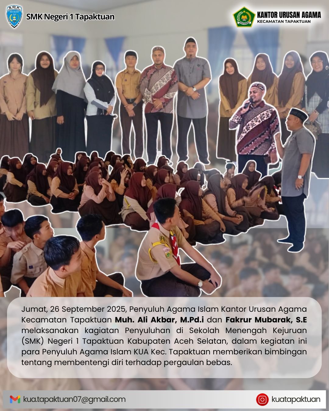 Dalam konteks inilah, penyuluhan dengan tema “Tantangan Pergaulan Bebas” yang diselenggarakan pada (Jumat, 26 September 2025) di Aula SMKN 1 Tapaktuan menjadi langkah strategis dalam memberikan pemahaman sekaligus kesadaran bagi peserta didik.