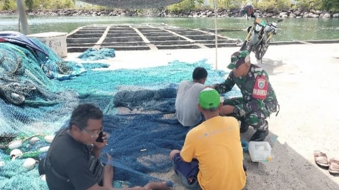 Kegiatan tersebut berlangsung di Balai Pasi, Jurong Mustika Kolam Bermata, saat para nelayan tengah memperbaiki jaring atau pukat yang rusak akibat digunakan melaut beberapa hari sebelumnya. Suasana penuh keakraban terlihat ketika Babinsa duduk bersama para nelayan, berbincang santai sembari menyaksikan proses perbaikan jaring.