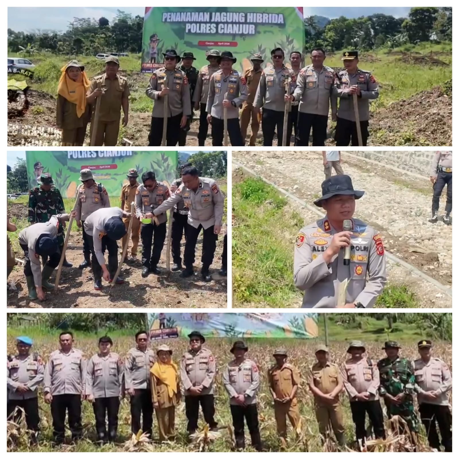 Cianjur — Dalam rangka mendukung program pemerintah dalam hal ketahanan pangan nasional, Polres Cianjur menggelar kegiatan panen raya sekaligus penanaman jagung hibrida di lahan pertanian seluas 10 hektar yang berlokasi di Desa Mekarsari, Kecamatan Cikalongkulon, Kabupaten Cianjur pada Senin (6/4).