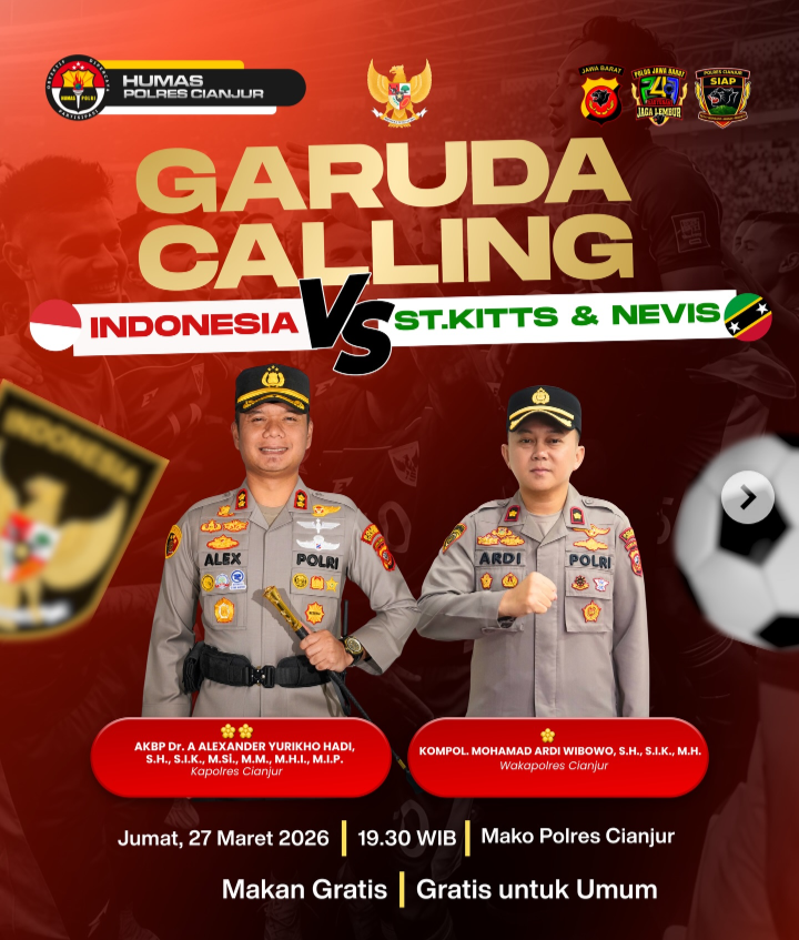 Polres Cianjur menggelar kegiatan nonton bareng (nobar) pertandingan persahabatan Tim Nasional Indonesia melawan Saint Kitts dan Nevis pada Jumat, 27 Maret 2026 pukul 19.30 WIB, bertempat di Mako Polres Cianjur.