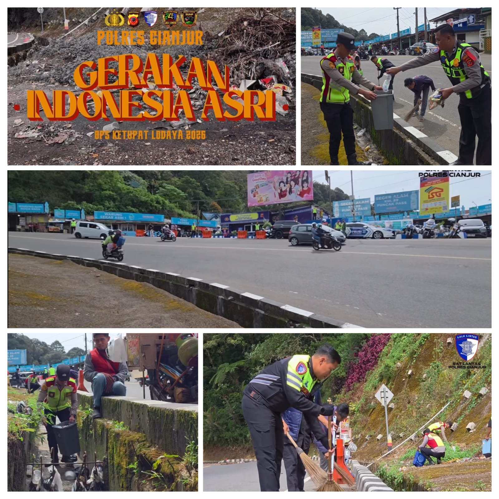 Cianjur Jabar – 24 Maret 2026 – Dalam rangka mendukung implementasi program Gerakan Indonesia ASRI (Aman, Sehat, Resik, Indah), Polres Cianjur melalui Satuan Lalu Lintas melaksanakan kegiatan kerja bakti berupa aksi bersih-bersih lingkungan di sekitar Pos Pengamanan 1 Cepu, Puncak Pass, Kabupaten Cianjur.