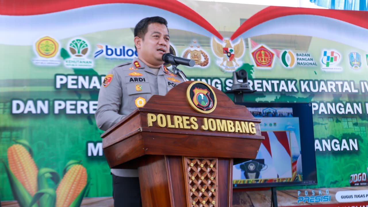 Kapolres Jombang, AKBP AKBP Ardi Kurniawan, S.H., S.I.K., CPHR dalam sambutannya menyampaikan, bahwa penanaman jagung serentak ini adalah bentuk nyata sinergi antara TNI, Polri, pemerintah daerah, dan masyarakat dalam menjaga ketahanan pangan serta mendukung program pemerintah pusat.