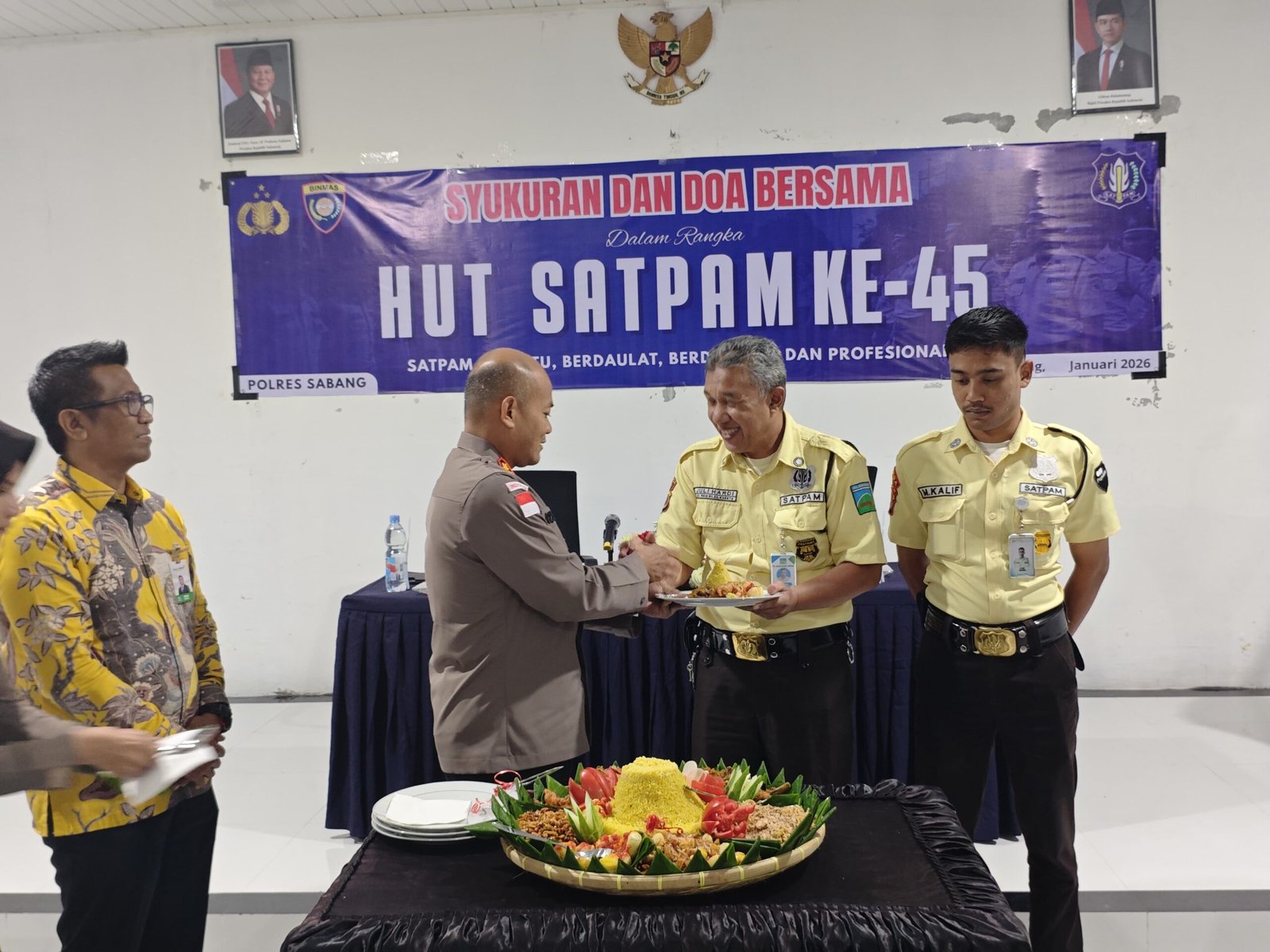 Rangkaian kegiatan diantaranya doa bersama sebagai wujud rasa syukur atas pengabdian Satpam selama 45 tahun dalam membantu menjaga keamanan dan ketertiban masyarakat, Kegiatan dilanjutkan dengan prosesi pemotongan tumpeng yang dilakukan oleh Kapolres Sabang sebagai simbol kebersamaan dan harapan agar Satpam semakin profesional dalam menjalankan tugas.