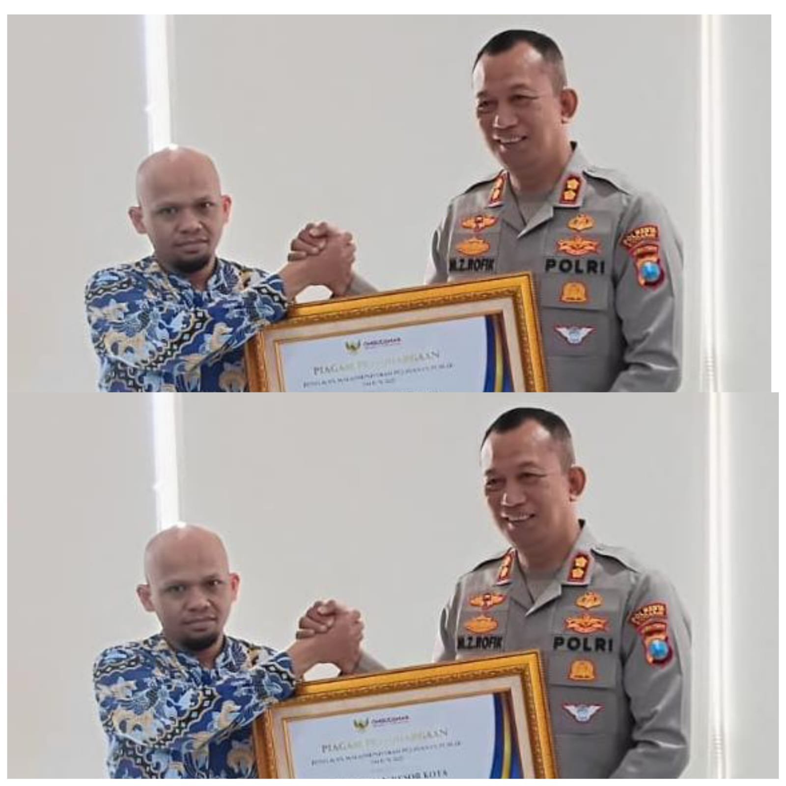 Penghargaan diserahkan oleh perwakilan Ombudsman RI Jawa Timur, Triyoga Muhtar Habibi, kepada Karo Rena Polda Jatim Kombes Pol Harries Budiharto dan Wakapolresta Sidoarjo AKBP Mohammad Zainur Rofik di Ruang Biro Rena Polda Jawa Timur, Selasa (7/4/2026).