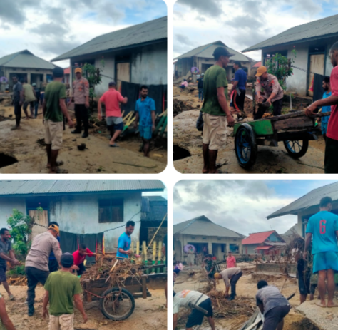 Kegiatan yang dimulai pukul 09.20 WIT ini dipimpin langsung oleh Kapolsubsektor dan melibatkan partisipasi aktif warga setempat. Fokus kerja bakti meliputi pembersihan rumah warga yang terdampak banjir, pembersihan jalan desa dari lumpur, serta normalisasi saluran air yang tersumbat oleh material sisa banjir.