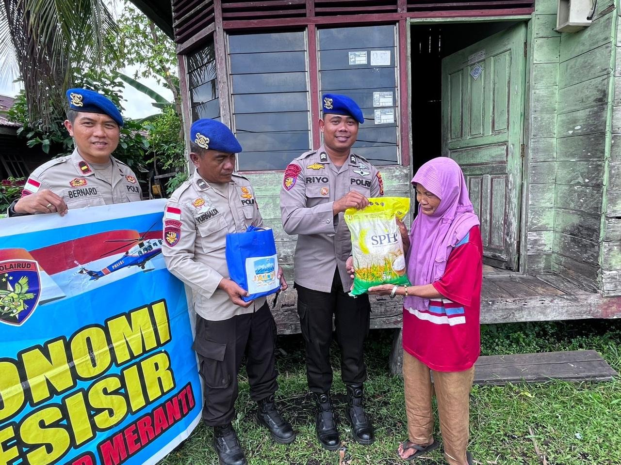 Melalui program peduli ekonomi pesisir, Sat Polairud juga menyerahkan dua paket sembako kepada warga kurang mampu. Setiap paket berisi beras premium 5 kilogram, satu kotak teh, setengah papan mi telur, dan satu liter minyak goreng.