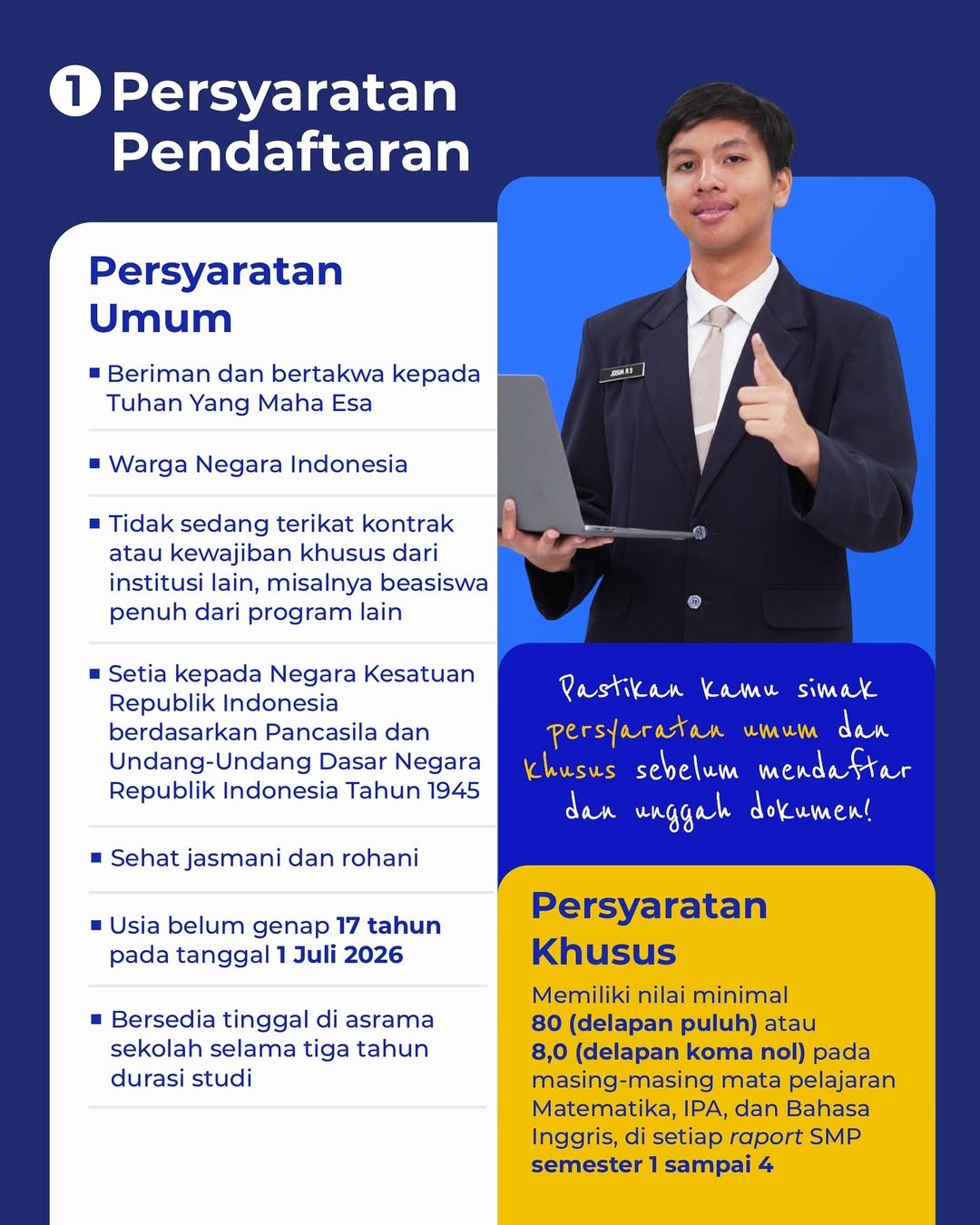 Instrumen penilaian meliputi Tes Potensi Akademik, kemampuan Bahasa Inggris (IELTS), psikotes, serta tes kesehatan dan jasmani. Nilai minimal untuk mata pelajaran IPA, Matematika, dan Bahasa Inggris ditetapkan sebesar 80.