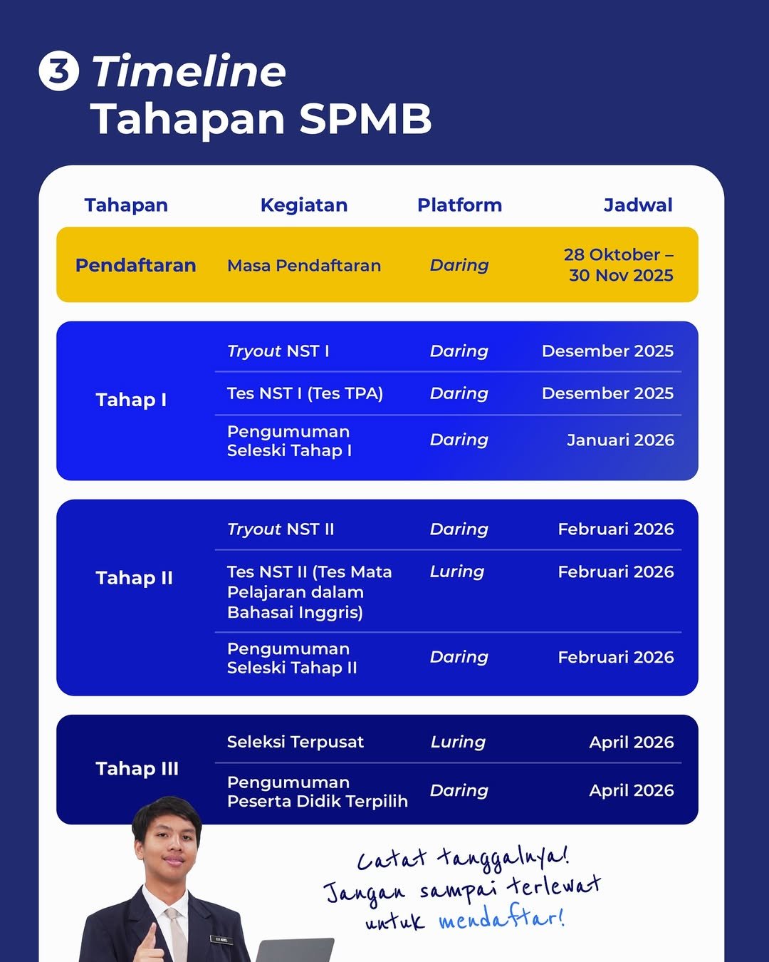 Tahap selanjutnya, calon siswa mengikuti Nusantara Standardized Test Tahap II secara tatap muka pada Februari 2026. Setelah pengumuman hasil tahap kedua, seleksi terpusat akan digelar pada April 2026 yang mencakup tes kesehatan, psikologi, jasmani, dan forum group discussion. Hasil akhir akan diumumkan pada bulan yang sama.