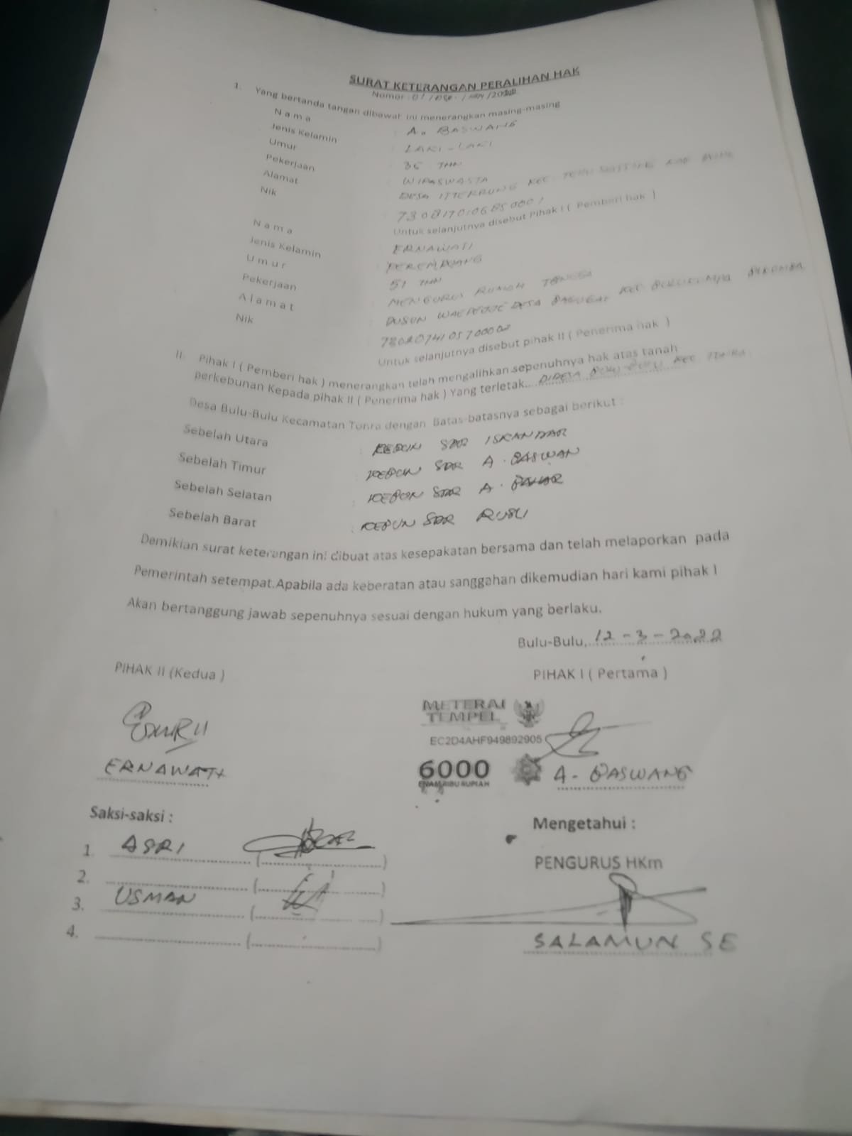 Pihak HKM turung memberikan atau menjelaskan bahwa lokasi ini adalah milik yang ganti Rugi pertama .karena Surat ganti ruginya lengkap .Ernawati ganti rugi dari Andi BasWan tanda tangan di bubuhi materi. Saksi. Pengurus HKM Saksi 1 Asri dan saksi 2 pihak Ernawati Saks 2 adalah Usman dari Bulukumba dan yang mengetahui Salamun pengurus HKM disertai Stempel untuk itu kami harapkan pihak HKM memberikan klarifikasi dan harus menyelesaikan masalah ini secara adil dan transparan.