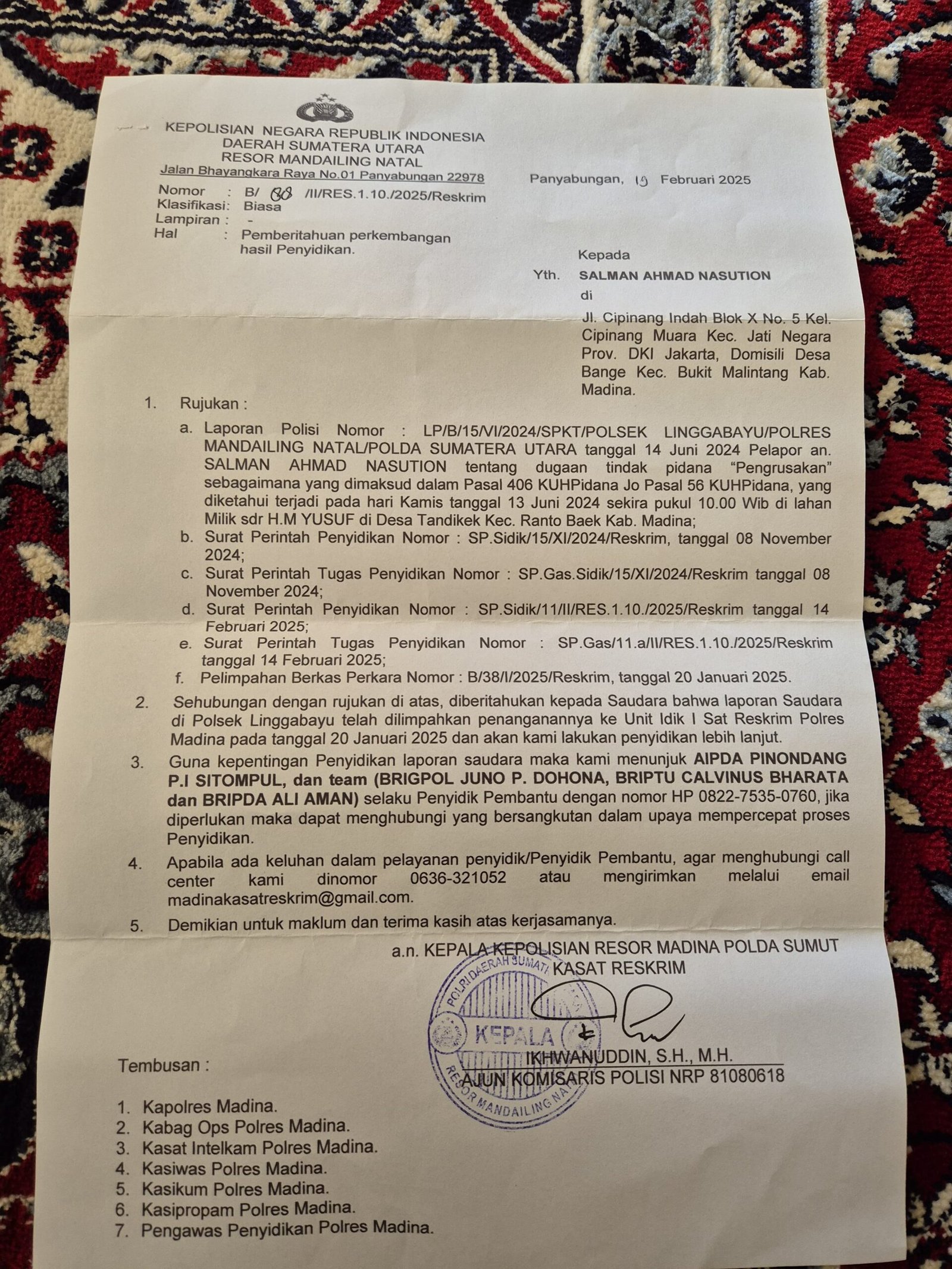 Sebelumnya Buya Salman menyesalkan perbuatan terlapor yang sempat merusak lahannya sebelum dilaporkan ke pihak berwajib.