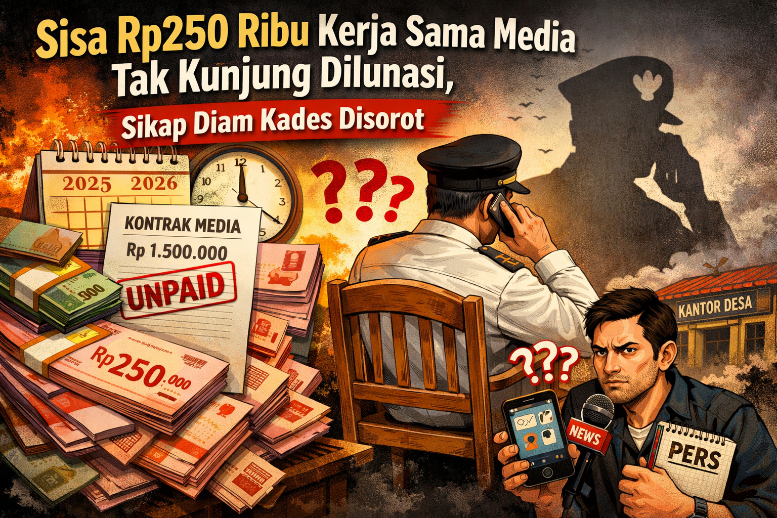 Kerja sama publikasi tersebut berlangsung selama satu tahun pada 2025 dengan nilai kontrak Rp1,5 juta. Namun hingga pertengahan Maret 2026, masih tersisa tunggakan sebesar Rp250 ribu yang belum dibayarkan oleh pihak pemerintah desa Kelaan.