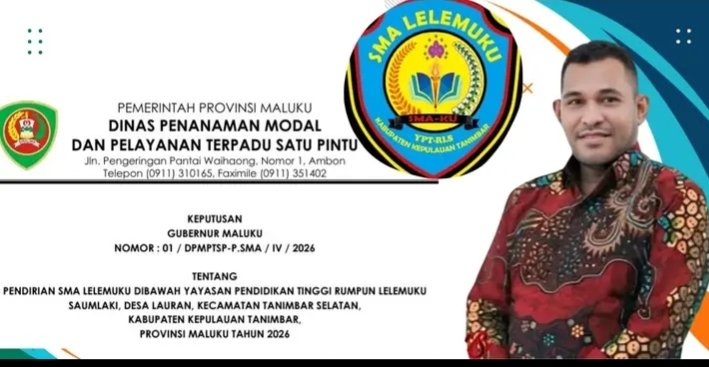 Kpktipikor.id – Tanimbar, Kabar baik bagi dunia pendidikan di Kabupaten Kepulauan Tanimbar. SMA Lelemuku Saumlaki (SMA KU) resmi memperoleh izin pendirian dari Pemerintah Provinsi Maluku melalui Keputusan Gubernur Maluku Nomor 1 Tahun 2026 dengan Nomor: 01/DPMPTSP-P.SMA/IV/2026 tertanggal 1 April 2026.