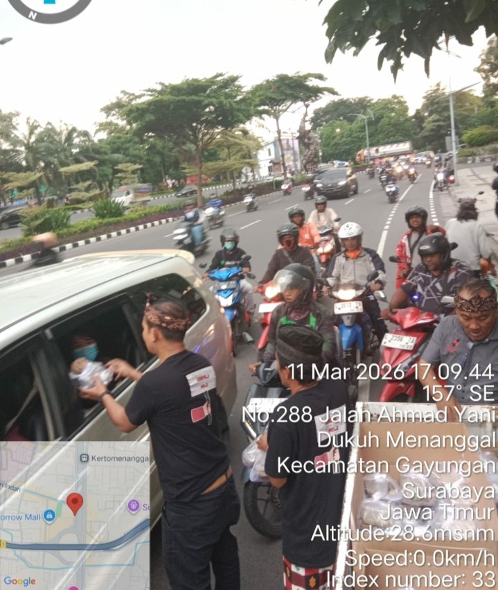 Para relawan dari Tim Takjil MAKI Jatim tampak turun langsung ke jalan untuk membagikan paket takjil kepada para pengendara roda dua, pengemudi ojek online, hingga warga sekitar yang melintas di kawasan tersebut.
