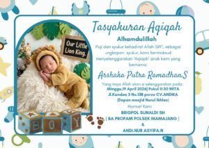 Brigpol Sunaldi menambahkan harapan besar untuk masa depan putranya. “Arshaka Putra Ramadhan kelak tumbuh menjadi anak yang sholeh, sehat, cerdas, serta menjadi kebanggaan kedua orang tua, keluarga, dan agama,” tuturnya.
