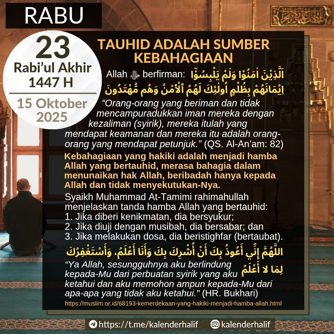 15 Oktober 2025 Tauhid adalah mengesakan Allah dalam ibadah, orang yang bertauhid hanya menjadikan Allah sebagai satu-satunya yang diibadahi. Inti dakwah para Rasul adalah menyeru dan mengajak umatnya kepada tauhid dan menjauhi syirik. Mentauhidkan Allah dalam rububiyah-Nya, uluhiyah-Nya dan dalam nama-nama-Nya yang maha indah dan sifat-sifat-Nya yang maha tinggi adalah sumber kebahagiaan di dunia dan di akhirat. Allah ﷻ berfirman: