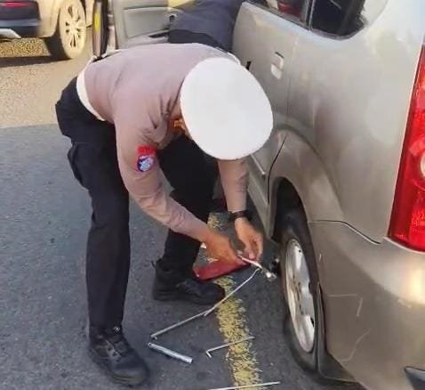 Kpktipikor.id // Kota Bekasi – Sebagai wujud nyata kepedulian dan pelayanan prima kepada masyarakat, Kanit Turjawali Satlantas Polres Metro Bekasi Kota, AKP Parwoto, bersama anggotanya menunjukkan aksi humanis dengan membantu seorang pengemudi kendaraan minibus yang mengalami kendala ban pecah di kawasan Bunderan Piramid Summarecon, Bekasi, pada Selasa pagi (4/11).